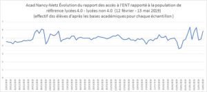 Sur la période du 02.0.8.2019 au 31.05.2019, sur l’académie de Nancy-Metz, nous relevons 2 610 893 connexions. C’est à dire 72.3 % de l’utilisation des connexions aux ressources numériques dans le secondaire.